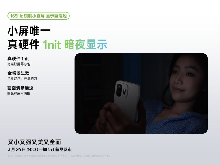 3 月 23 日,一加晓示全新小屏旗舰一加 15T 将搭载 165Hz 旗舰小直屏,初次为小屏用户带来超运动的 165Hz 超高刷体验。该屏幕经「自研屏幕科学产线」二次校准,领有「真硬件 1nit 暗夜浮现」与全新「明眸护眼」等多项屏显黑科技,并取得小屏旗舰独一「小金标」护眼认证,在运动度、浮现造就、暗结拜露、护眼才智四大维度全面升级,引颈小屏屏显体验大换代。