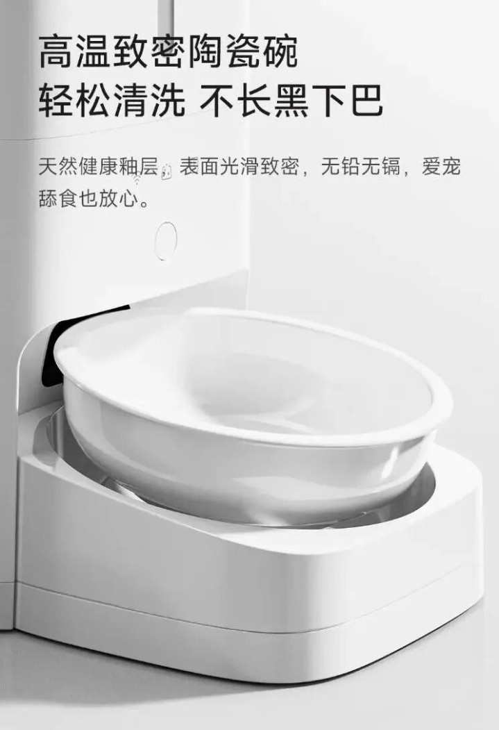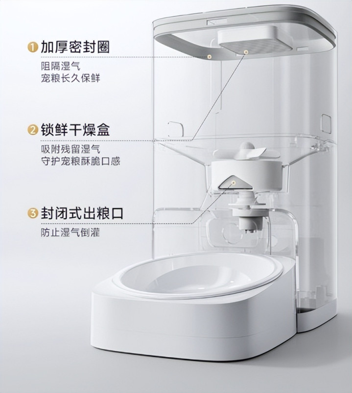 要说这个喂食器,主要卖点呢,在于各大品牌推出的防卡粮时刻、手机 APP 而已罢休、保鲜锁鲜、安全材质等等。