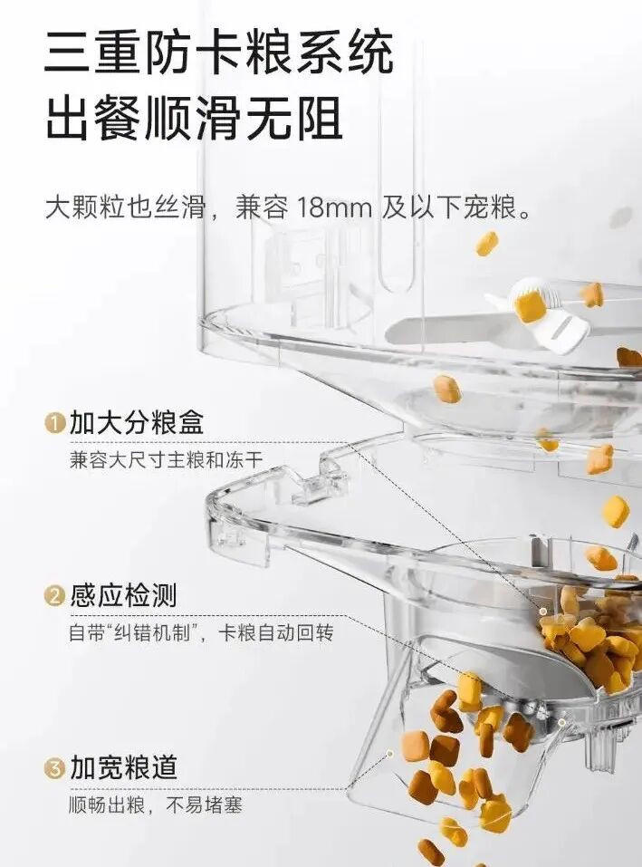 其中,防卡粮结构升级后,不错兼容 18mm 的宠物食粮,平素的猫粮,不错免了卡粮的黄雀伺蝉;