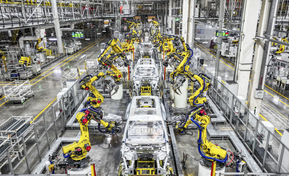 在位于重庆市两江新区的赛力斯汽车超等工场拍摄的自动化坐褥功课现场(2025年9月19日摄)。新华社记者 王全超 摄
