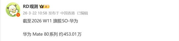 日前,数码博主“RD不雅测”公布了华为Mate 80系列的最新销量数据,字据数据袒露,端正2026年第11周,华为Mate 80系列累计销量达 453.01万台。公开信息袒露,该系列手机于2025年11月28日珍惜开售,上市于今约四个月。销量比拟上代Mate 70系列有剖释进步。华为Mate 70系列上市88天销量约为280万台,这次Mate 80系列同期销量多出近100万台。