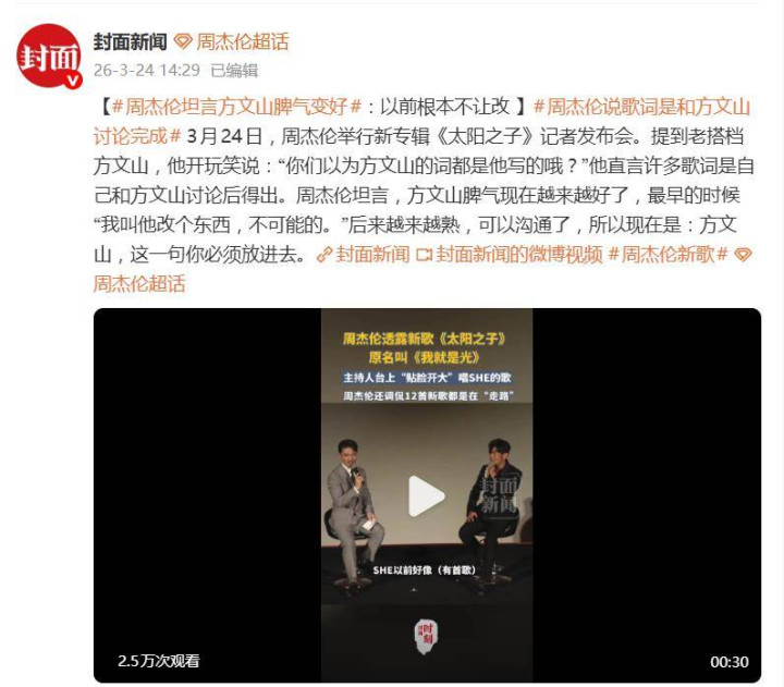 在3月24日的发布会上,周杰伦不仅涌现了这首重磅新歌原名叫“我即是光”,还揭秘了这个最终命名《太阳之子》的由来:竟是歌神张校友看完他的香港演唱会后所赠的称呼。不外,整场发布会最“炸”的点,莫过于他亲口证据了与老搭档方文山二十五年协作方法的“历史性滚动”。